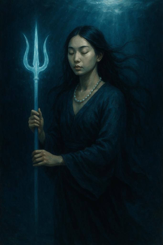 El Trident és l’eina de discerniment que travessa les aigües fosques del desconegut. Simbolitza l’eix central, el canal que connecta el món visible amb les profunditats invisibles de l’ésser.