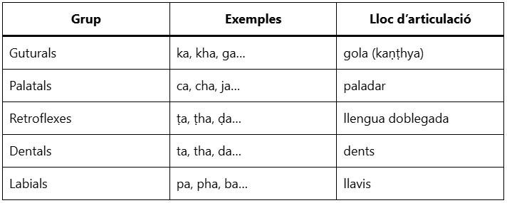 El sistema consonàntic del sànscrit s’ordena segons on es produeix el so dins la boca, i com es modifica. Les veurem en detall més endavant, però aquí tens un resum dels seus grups: