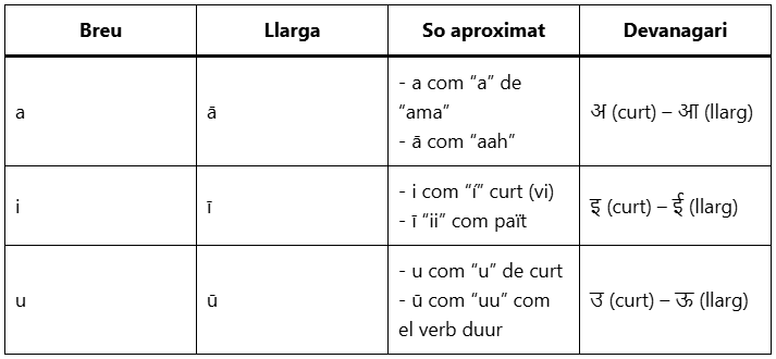Les vocals del sànscrit es divideixen segons la seva durada i estructura. Veurem més en detall la seva escriptura en devanagari però per ara, centrem-nos en els conceptes fonamentals: