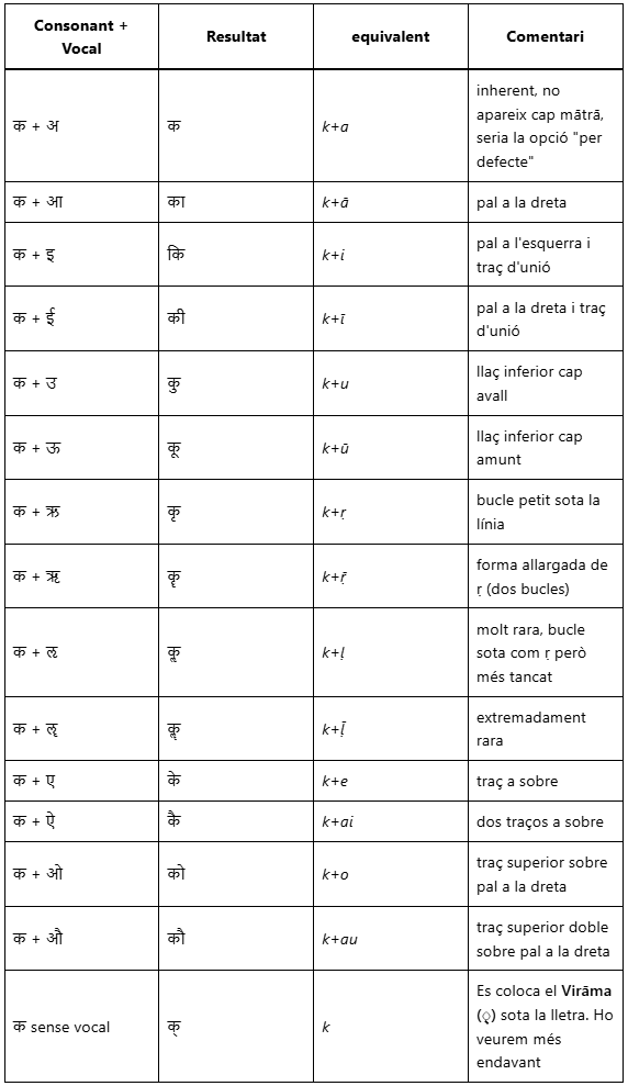 Quan la vocal acompanya una consonant, adopta una forma modificada (mātrā), que es col·loca al voltant de la consonant. Per exemple: