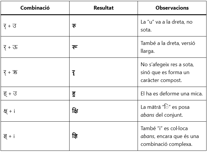 Encara que la majoria de mātrās segueixen patrons regulars, hi ha algunes consonants o combinacions que tenen formes lleugerament especials o modificades, sobretot quan: